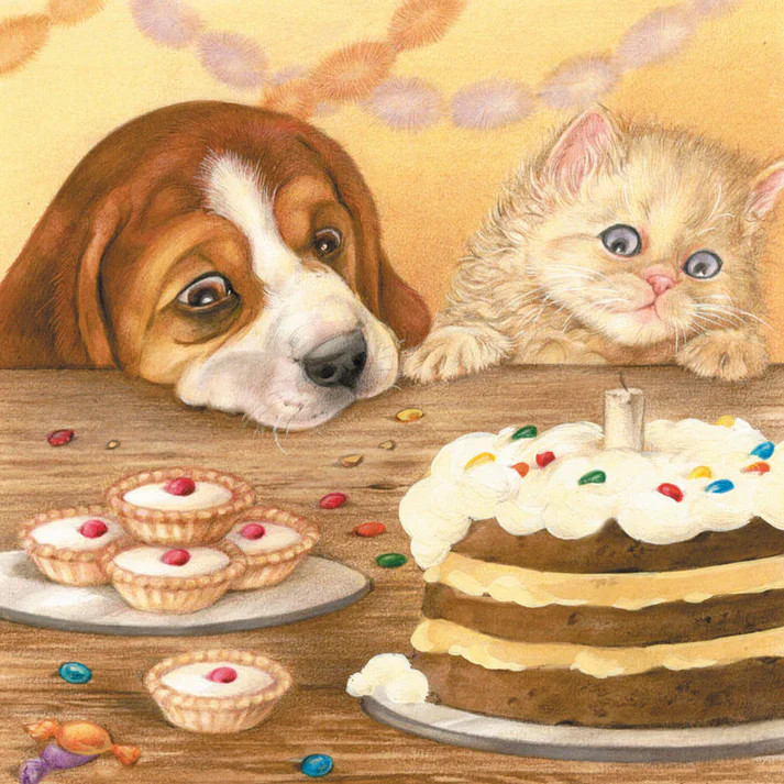 Beagle and Persian having a piece of cake together
